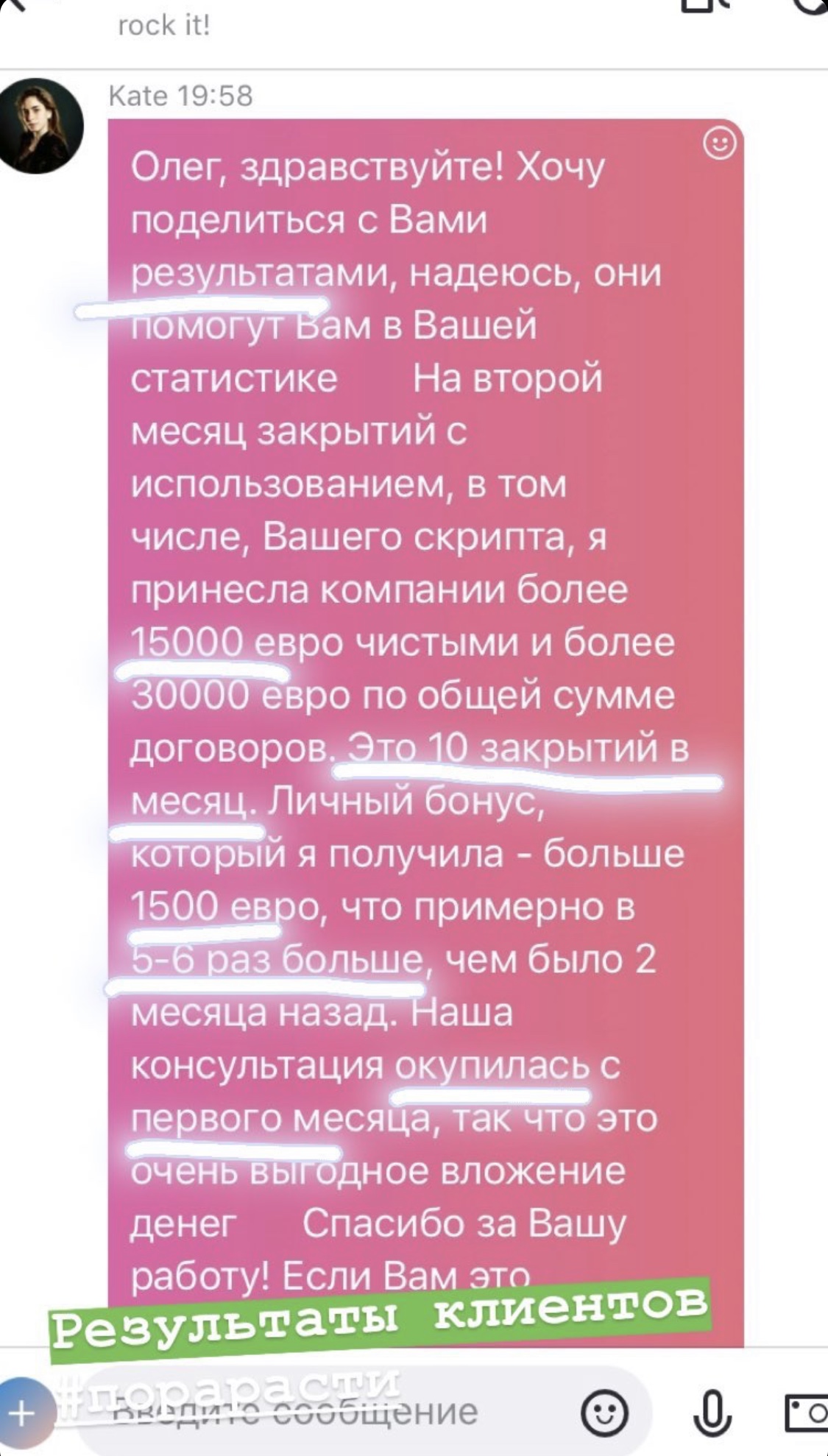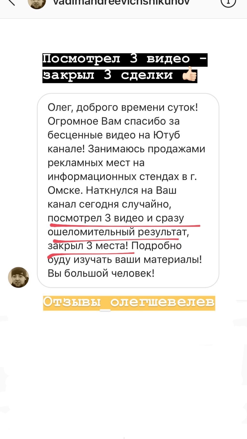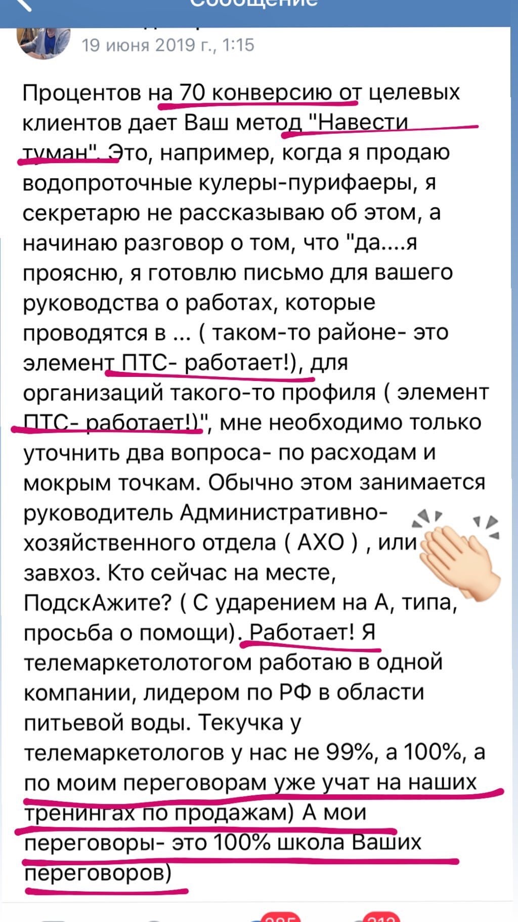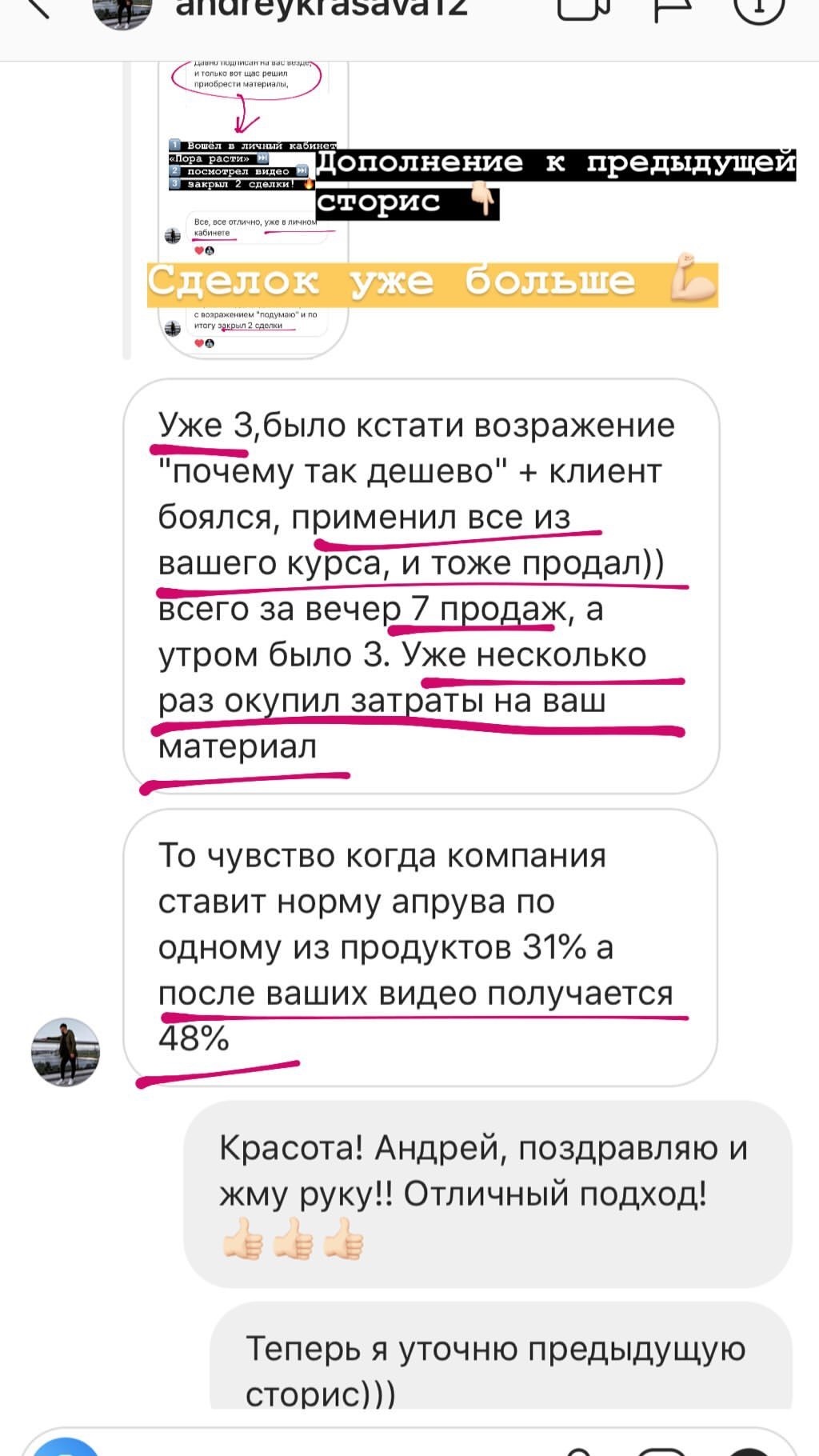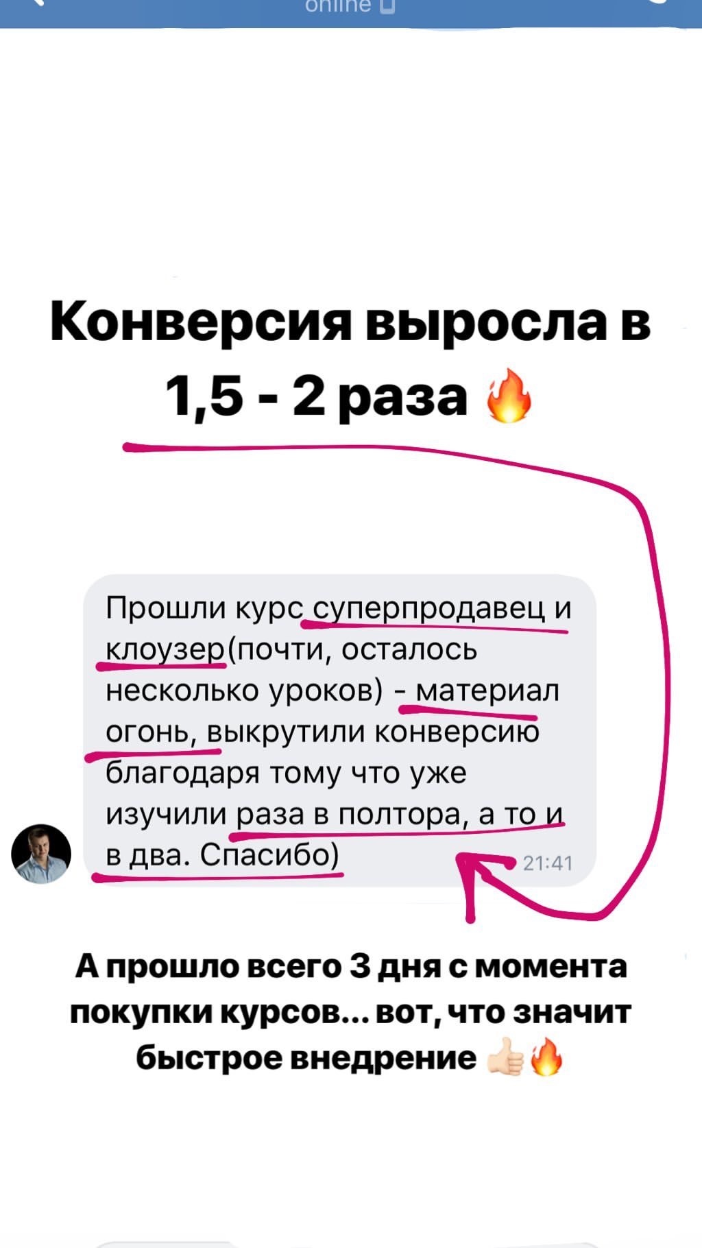 После смены речевых блоков, удалось добиться того, что больше клиентов стало относится с доверием к тому, что я говорю, проще стало отделять тех, кто мне точно не будет интересен в ближайшей перспективе. Просто люди стали больше и без стеснения предоставлять мне нужную информацию. Покупкой доволен, в каждый курс Олег вложил максимум внимания к покупателю, постарался разъяснить все шаги, которые некоторым людям помогут легко пройти обучение.